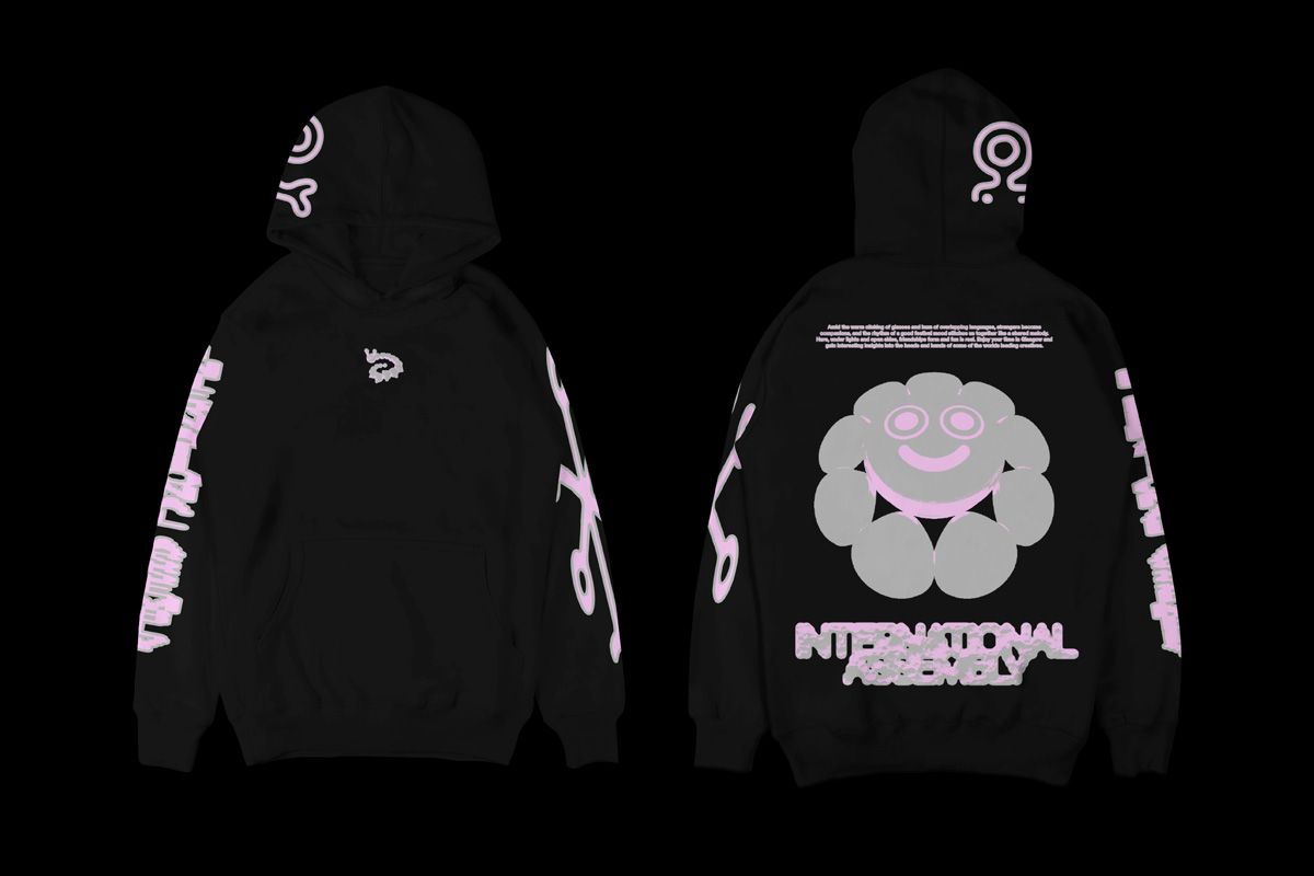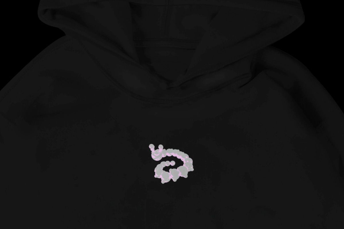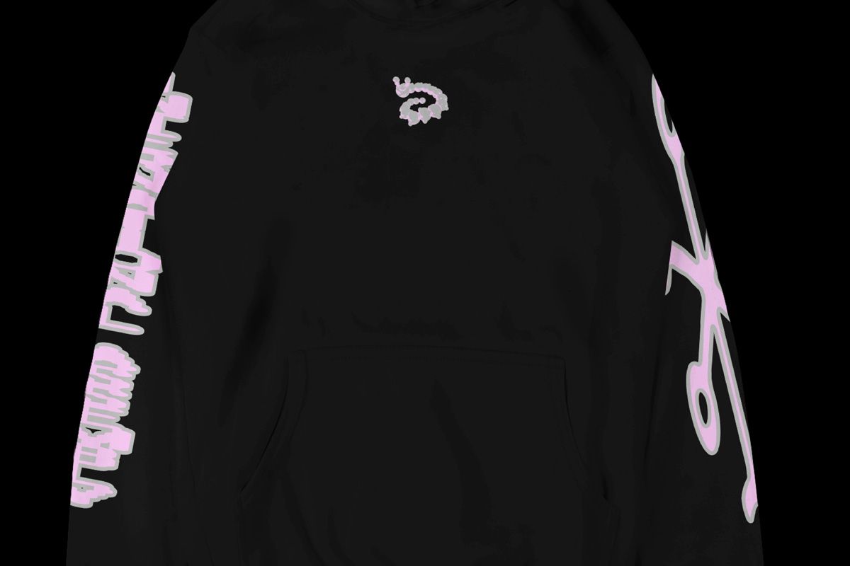 Cloud grey and pastel pink on black heavyweight cotton hoodie with two-colour front, back, sleeve and hood print. Designed by Warriors Studio and NAM. Produced in collaboration with Merchery.